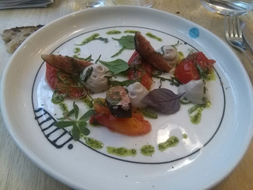 Per prenotare una cena a Montpellier occorre scegliere tra tanti raffinati ristoranti che propongono menu degustazione a prezzi accessibili. Tra questi i più conosciuti sono l’Alliance des Plaisirs, nel cuore hipster di Montpellier, e Leclere, cuisine d’arrivage, dove occorre prenotare con almeno un mese di anticipo, con una terrazza nel centro storico di Montpellier. L’hotel ha prenotato per noi il ristorante Anga, piccolo e curato. aperto circa un anno e mezzo fa, e la cena è stata davvero speciale. Ci hanno accolto con gentilizza spiegandoci ogni portata servita, iniziando dal burro di montagna aromatizzato al limone e burro al sale affumicato (Le Beurre Bordier) ad accompagnare del pane integrale tostato. Abbiamo scelto un vino bianco, Domaine Mirabel Pays d’Oc, biologico locale, che ha accompagnato le tre portate del pasto (32€ scegliendo tra carne oppure pesce). Un pre-antipasto (sorbetto al cetriolo con pesche affumicate, pinoli ed erba cipollina) seguita da un originale antipasto, un quadro astratto con tocchi di mousse di sarde, pomodori caramellati, fichi e pesto di sedano, che univa gusti dolci e sapidi in armonia, colore e bellezza, ci hanno fatto capire come sarebbe proseguita la serata. Fabio ha scelto un succulento petto d’anatra su letto di nocciole tritate e coriandolo mentre io e Franci abbiamo preso il branzino su rataouille fresca di verdure e patate al forno. A conclusione del pasto un delicato dessert con albicocca schiacciata con menta, sorbetto di pesca e focaccia dolce. Il conto di 107€ rispecchia la qualità del cibo e la preparazione del personale. Esperienza davvero positiva!