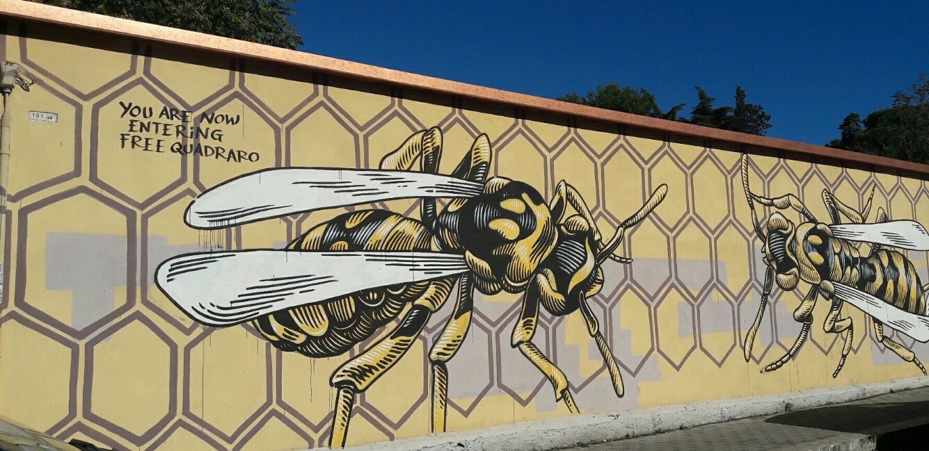 Giriamo l’angolo dove ci aspetta “Via del Monte del Grano”, un enorme murale di Lucamaleonte, protagonista della street art romana (è sua un’opera alla fermata Spagna della metropolitana, il faccione di Totti e altre note opere in giro per la città). Sono delle vespe gigantesche su sfondo di alveare giallo e grigio (per dare profondità) realizzate su un muro privato con l’obiettivo di dimostrare che la streetart non è fatta di scarabocchi e scritte che deturpano ma di opere che li nobilitano. Sono sette vespe, ognuna rappresenta un decennio a partire dal 1944 sino al 2014, anno della realizzazione del murale, mentre l’intero nido di vespe è simbolo di un quartiere ribelle, mai domo, sovversivo. Tutti gli artisti hanno lavorato a titolo gratuito e per velocizzare il lavoro del murale, Lucamaleonte ha prima realizzato dei disegni che ha scansionato e proiettato sul muro creando i contorni poi riempiti con la vernice. Questa tecnica ha consentito di realizzare il Murale in soli tre giorni, cambiando il modo di realizzare dalla mano libera alla tecnica dello stencil (esagono ritagliato dal cartone e posato sul muro) in modo da uniformare le dimensioni delle celle accorciando i tempi. La scritta “You are now entering the free Quadraro” riprende quella dell’IRA in Irlanda (riferita a Derry), mentre la firma dell’artista Lucamaleonte è un poliedro leonardiano.