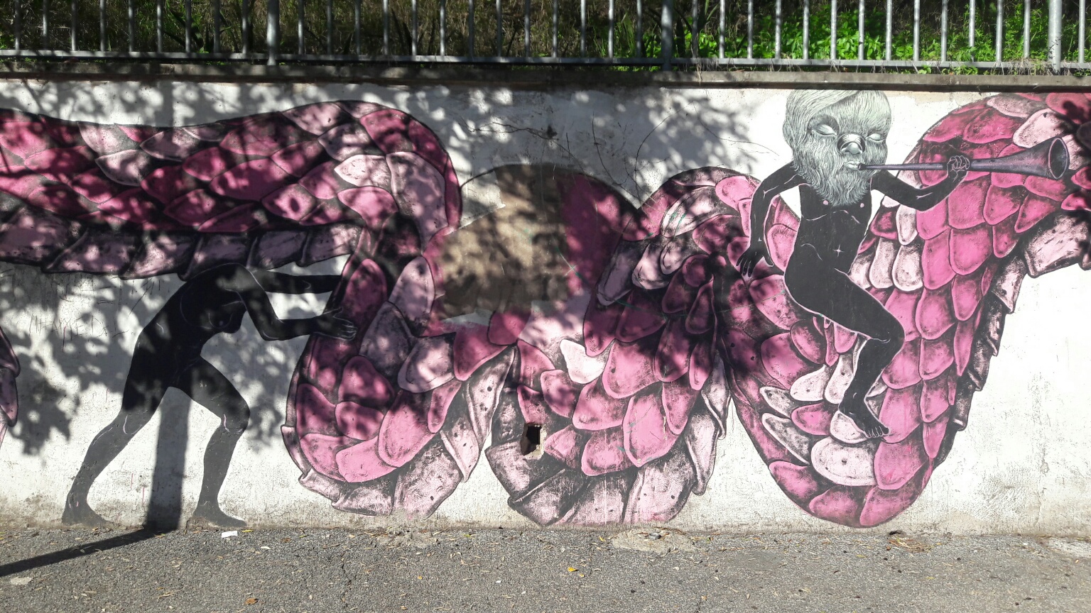 MURo sta per Museo di Urban di Roma che ha inizio dal Quadraro, zona a Sud Est della capitale, attigua a Tor Pignattara con l’obiettivo di arrivare sino al centro storico, per unire l’arte contemporanea a quella classica, per la quale Roma è riconosciuta in tutto il mondo. La nostra guida Giorgio Silvestrelli è un appassionato volontario del progetto MURo, proveniente da Ancona, laureato in comunicazione e ora residente a Roma, che assiste e aiuta gli artisti durante la realizzazione dei graffiti. Ci racconta che il progetto è partito nel 2011 dal lungo muro verso la galleria di accesso al quartiere Quadraro, messo a disposizione dei writers dal Comune di Roma, su cui David Vecchiato, detto Diavù, pittore romano diplomato all’Accademia di Belle Arti, ha creato il logo-mascotte del progetto MURo, di cui è promotore. Verso il personaggio creato da David, ruotano tanti fantasmini-spermatozoi intenti a fecondare di arte e creatività il Quadraro, trasformato in un museo di arte contemporanea a cielo aperto. Il baloon (fumetto) è completato dal claim “Art Pollinates Quadraro – L’arte feconda il Quadraro” in modo gratuito e fruibile da tutti i residenti.